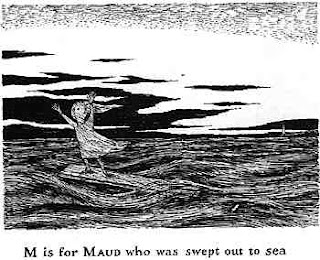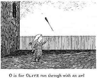 it’s about 26 children (each representing a letter of the alphabet) and their untimely and gruesome deaths. it’s written in rhyming dactylic couplets. ie: A is for Amy who fell down the stairs, B is for Basil assaulted by bears. C is for Clara who wasted away, D is for Desmond thrown out of a sleigh, etc etc.