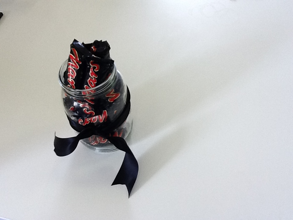 Grab a jar, stuff it full of just about anything (marshmellow mice work really well), wrap a ribbon around it and voila, the perfect gift.