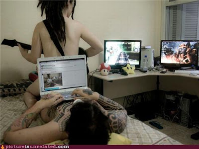 See, while getting busy doing ‘The Reverse Cowboy’, she’s playing Guitar Hero, and I can’t quite see what he’s up to, but my guess is he’s selling something on e-bay.