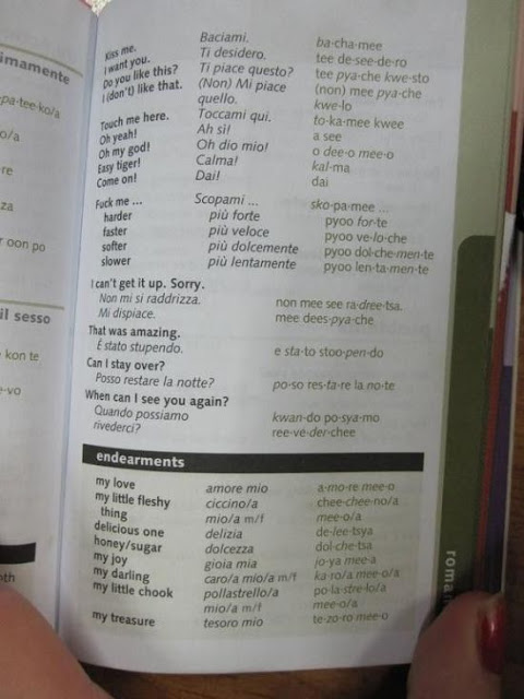 Now these kind folks who compiled this dictionary have been clever enough to supply a whole page of translations specifically in case you find yourself going on a date with an Italian man or woman and need to be able to communicate important date-type things in Italian: