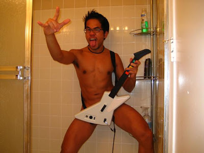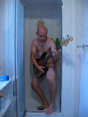 i think this guy is more into the guitar than he is the shower. although he is definitely making love to the camera, in his own special way.